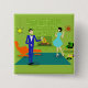 This Mid Century Modern Couple Button looks like a scene out of a romantic comedy. The 1960's style, minimalist art design features an attractive cartoon couple enjoying a romantic evening at home. The sophisticated room prominently features a green stone wall with a roaring fire in the fireplace. The furnishings in the room include an orange, lounge chair with matching footstool, a red, starburst wall clock, a yellow, sputnik light fixture, and an orange side table, which is home to a green, portable record player. On the floor beside the end table, a vinyl record can be seen poking out of a kitschy album cover. In the center of the green flooring, there is a large, rectangular, teal rug. In the middle of the scene, we have a very sophisticated couple. There is a suave man in a royal blue suit, white shirt and blue bow tie. The tall, dark and handsome man is gazing at his lovely companion. The elegant, raven haired woman is wearing a flouncy aqua dress. They are each holding a crystal martini glass with a floating olive. Cheers! Here's to the perfect evening at home!