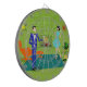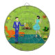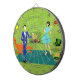 This Mid Century Modern Couple Dart Board looks like a scene out of a romantic comedy. The 1960's style, minimalist art design features an attractive cartoon couple enjoying a romantic evening at home. The sophisticated room prominently features a green stone wall with a roaring fire in the fireplace. The furnishings in the room include an orange, lounge chair with matching footstool, a red, starburst wall clock, a yellow, sputnik light fixture, and an orange side table, which is home to a green, portable record player. On the floor beside the end table, a vinyl record can be seen poking out of a kitschy album cover. In the center of the green flooring, there is a large, rectangular, teal rug. In the middle of the scene, we have a very sophisticated couple. There is a suave man in a royal blue suit, white shirt and blue bow tie. The tall, dark and handsome man is gazing at his lovely companion. The elegant, raven haired woman is wearing a flouncy aqua dress. They are each holding a crystal martini glass with a floating olive. Cheers! Here's to the perfect evening at home!