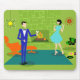 This Mid Century Modern Couple Mousepad looks like a scene out of a romantic comedy. The 1960's style, minimalist art design features an attractive cartoon couple enjoying a romantic evening at home. The sophisticated room prominently features a green stone wall with a roaring fire in the fireplace. The furnishings in the room include an orange, lounge chair with matching footstool, a red, starburst wall clock, a yellow, sputnik light fixture, and an orange side table, which is home to a green, portable record player. On the floor beside the end table, a vinyl record can be seen poking out of a kitschy album cover. In the center of the green flooring, there is a large, rectangular, teal rug. In the middle of the scene, we have a very sophisticated couple. There is a suave man in a royal blue suit, white shirt and blue bow tie. The tall, dark and handsome man is gazing at his lovely companion. The elegant, raven haired woman is wearing a flouncy aqua dress. They are each holding a crystal martini glass with a floating olive. Cheers! Here's to the perfect evening at home!