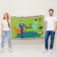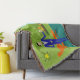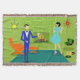 This Mid Century Modern Couple Throw Blanket looks like a scene out of a romantic comedy. The 1960's style, minimalist art design features an attractive cartoon couple enjoying a romantic evening at home. The sophisticated room prominently features a green stone wall with a roaring fire in the fireplace. The furnishings in the room include an orange, lounge chair with matching footstool, a red, starburst wall clock, a yellow, sputnik light fixture, and an orange side table, which is home to a green, portable record player. On the floor beside the end table, a vinyl record can be seen poking out of a kitschy album cover. In the center of the green flooring, there is a large, rectangular, teal rug. In the middle of the scene, we have a very sophisticated couple. There is a suave man in a royal blue suit, white shirt and blue bow tie. The tall, dark and handsome man is gazing at his lovely companion. The elegant, raven haired woman is wearing a flouncy aqua dress. They are each holding a crystal martini glass with a floating olive. Cheers! Here's to the perfect evening at home!