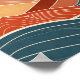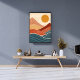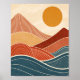 Evoke the serene beauty of a desert landscape with this mid-century modern inspired artwork. Abstract geological forms in warm terracotta, rust, and gold hues rise beneath a vibrant, oversized sun, while stylized waves of deep blue and teal introduce a surprising element of fluidity and calm. White linear details accentuate the contours of the mountains and waves, adding a sophisticated, minimalist touch. This piece captures the essence of a tranquil desert evening, blending earthy tones with a refreshing splash of cool blues, perfect for adding a touch of sophisticated calm to any contemporary space.