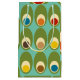 This gift bag has a mid-century modern design of green ovals with ovals and circles in them making them look like eggs in retro colors of red, yellow, blue, green, brown, and orange on a field of light blue.