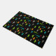 Mid-Century modern geometric abstract black doormat in colors of the time period on a black background.