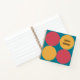 A spiral-bound notebook with mid-century modern circles design on the cover. The circles are red and yellow on a blue background. Personalize the chic notebook with the recipient's name for the finishing touch.
