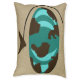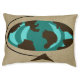 Travel around the world with this Mid Century Modern Globe Art Dog Bed. The front design features an abstract oval globe with wood grain continents. The oceans are in shades of teal and turquoise. The globe is on a triangular wooden stand and the whole world is on a wheat colored background. The opposite side features a solid chocolate fabric.