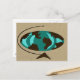 Travel around the world with this Mid Century Modern Globe Art Postcard. The design features an abstract oval globe with wood grain continents. The oceans are in shades of teal and turquoise. The globe is on a triangular wooden stand and the whole world is on a wheat colored background.