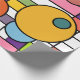 This wrapping paper has a mid-century modern design of a grid with some rectangles colored in and circles on top in retro colors.