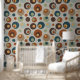 This fun and groovy wallpaper is for retro design lovers, with circle pattern in mid century modern style, colorful and stylish with green, blue, orange-red accents.