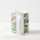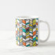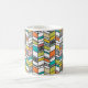 This mug has a mid-century modern design of herringbone with retro colors and lines filling some of the spaces.