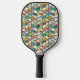 This pickleball paddle has a mid-century modern design of herringbone with retro colors and lines filling some of the spaces.