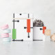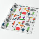 This wrapping paper has a mid-century modern design of a large grid of horizontal and vertical black lines with colorful rectangles.