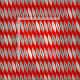 Fabric in a Mid-Century Modern design of abstract leaves in shades of light silver gray / grey to medium gray,accented with graphite gray and tomato red, on a dark Chinese red background