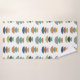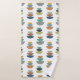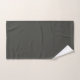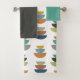 This towel set has a turquoise washcloth, a charcoal black hand towel, and a bath towel with a mid-century modern design of semicircles stacked in three in retro colors on a field of white. Want the same design with different colors? Message me.