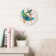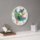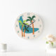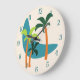 This cool wall clock with a retro vibe features a Mid Century inspired graphic of minimalist palm trees in orange and green set around a boomerang shaped oasis or swimming pool in an aqua blue. The sand background color may be edited.