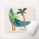 Personalized name text is featured on this mouse pad that has a retro vibe along with a Mid Century influenced designof minimalist palm tree graphics in orange and green set around a boomerang shaped oasis or swimming pool in a vivid aqua blue. The sand background color may be edited.