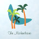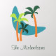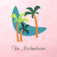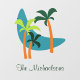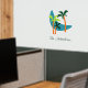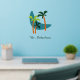 This wall decal with easy to personalize name text features a Mid Century inspired image with simple palm tree graphics in orange and green set around a boomerang shaped oasis or swimming pool in an aqua blue.