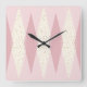This Mid Century Modern Pink Argyle Square Acrylic Wall Clock (large print) pattern features a First Lady pink background and a pattern of mod, translucent, blush diamonds overlaying larger, vintage cream diamonds with gold colored, space age speckles. This minimalist inspired, deconstructed argyle is a simplistic throwback of the larger than life atomic era that dominated the decorating landscape of the 1950s and 1960s. This kitschy design is reminiscent of everything from retro Palm Springs’ bowling alley signs to classic TV shows to the television trays you used at your grandma’s house.