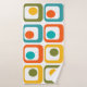 This towel set has a turquoise washcloth, a green hand towel, and a bath towel with a mid-century modern design of four rounded rectangles in four rows with ovals inside them in orange, yellow, green, and turquoise.