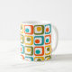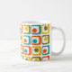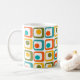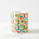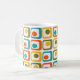 This mug has a mid-century modern design of four rounded rectangles in four rows with ovals inside them in orange, yellow, green, and turquoise.