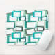 This mouse pad has a mid-century modern design of skewed rectangles with white holes in shades of blue-green.