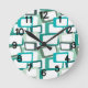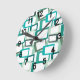 This clock has a mid-century modern design of skewed rectangles with white holes in shades of blue-green.