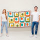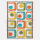 This throw blanket has a mid-century modern design of four rounded rectangles in four rows with ovals inside them in orange, yellow, green, and turquoise.