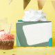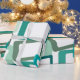 This wrapping paper has a mid-century modern design of skewed rectangles with white holes in shades of blue-green.