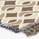 Mid-Century Modern design of intertwined ribbons in shades of taupe and tan, accented with white, on a deep chocolate brown background