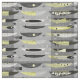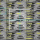 Funky space age ovals fabric with triangles. Colors of yellow, white and black on a grey, textured look background. Mid-century inspired fabric design. All graphics by Gail Gabel, LLC.