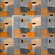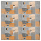 Mid-century modern space age abstract fabric in colors of grey, peach and orange on a grey background.