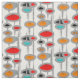 Funky space age ovals fabric with triangles. Colors of bright orange, red, teal and black on a white background. Mid-century inspired fabric design. All graphics by Gail Gabel, LLC.