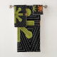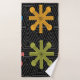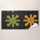 This towel set has a Mid-century modern design of starbursts in retro colors on a field of black.