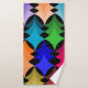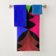This towel set has a bath towel with a mid-century modern design of retro stars in shades of red, orange, yellow, green, blue, and purple, a light blue washcloth, and a darker blue hand towel.