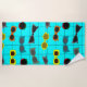 This beach towel has a mid-century modern design of retro sunglasses on a field of blue with a grid.