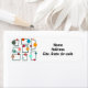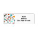 These return address labels have a Mid-century modern design of gray trapezoids with colorful circles on them.