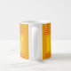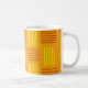 This mug has a mid-century modern design that looks like a weave with red and yellow lines on a field of gold.