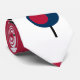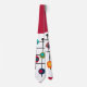 This tie has a mid-century modern design of a magenta rectangle with a white rectangle at the bottom with a black grid with retro circles on it.