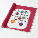 This wrapping paper has a mid-century modern design of a magenta rectangle with a white rectangle at the bottom with a black grid with retro circles on it.