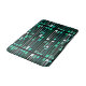 A midmod 1950s vintage style art design has simple geometric shapes of wide rectangles. multiple shades of teal, turquoise and aquamarine against a black background.