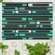 A midmod 1950s vintage style art design has simple geometric shapes of wide rectangles. multiple shades of teal, turquoise and aquamarine against a black background.