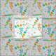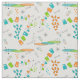 Mid-century modern space age atomic fabric with abstract shapes in colors of teal, orange and avocado green on a light grey background.