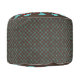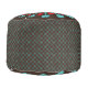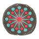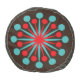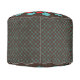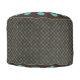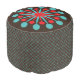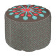 This bold pouf design features Mid Century modern style starburst motifs tipped with circles in turquoise and red on top and bottom and a cool retro pattern that coordinates on the sides.