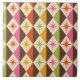 This is elegant mid century retro starbursts on colorful harlequin diamonds in brown, orange, red, pink and green. It's great looking decorative ceramic tile for anyone who love retro geometric designs