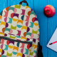 This geometric print has simple coordinating half circle shapes in turquoise blue, sunny yellow, dark purple, lime green, raspberry, orange, pink and cream. The abstract design has a cool modern look. This backpack coordinates with other items in the Palm Springs Collection from Delfuneum.