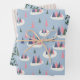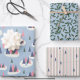 Cute and colorful designs are nostalgic yet modern with clean lines and contemporary colors. Designs include modern trees on mounds of snow, a pinstripe with trees and a classic holly sprig. Colors include blue, pink, green and white.