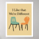 "I Like that We're Different" with two different styles of midcentury modern retro chairs. Is it a statement about your decorating style? Or maybe your relationship style? Fun retro look with mid century modern colors. Looks great in a modern black frame. Artwork copyright 2015 Visuaria Publishing.