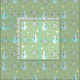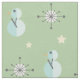 This retro mid century modern pattern with abstract snowmen, snowflakes and stars, in vintage colors of light blue and yellow against a faded green background.