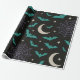 This seamless Halloween design features teal bats, crescent moons, twinkling stars, and eerie purple spiderwebs set against a deep black background. Perfect for wrapping paper, party décor, or festive crafts, the pattern blends playful spookiness with a modern color palette of teal, purple, and cream. A stylish choice for adding a touch of Halloween magic to any project.