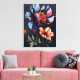 This captivating design features vibrant, abstract flowers against a dramatic midnight blue background. A unique and eye-catching piece that is sure to add a touch of modern sophistication to any home or office.
