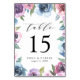 Elegant floral table number cards featuring your wedding details surrounded by a border of purple, mauve & blue watercolor flowers with lush green leaves. The design repeats on the back. Designed to coordinate with our Midnight Blooms wedding collection.